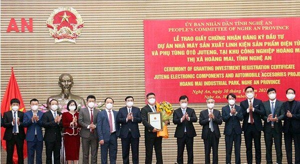 Bên cạnh đó, còn phải kể đến Dự án sản xuất linh kiện sản phẩm điện tử và phụ tùng ô tô của Tập đoàn JuTeng (Chu Thống) của Đài Loan tại KCN Hoàng Mai 1 có tổng mức đầu tư gần 200 triệu USD, tương đương với 4.602 tỷ đồng. Ngoài ra là Dự án Everwin của Công ty TNHH Công nghệ Everwin Precision Việt Nam chuyên sản xuất linh kiện điện tử, thiết bị truyền thông và các sản phẩm điện tử dân dụng tại Khu công nghiệp VSIP Nghệ An 1, có tổng mức đầu tư khoảng 400 triệu USD, trong đó giai đoạn 1 là 200 triệu USD, công suất thiết kế 270 triệu sản phẩm/năm